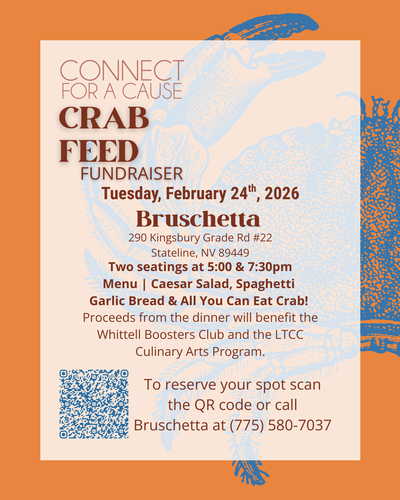 The Connect for a Cause Crab Feed, hosted by Bruschetta and the Tahoe Chamber, is an exclusive event bringing the community together for a delicious evening of crab and camaraderie, all while supporting vital local organizations. Scheduled for Tuesday February 24th, 2026, this fundraiser benefits the Whittell Boosters Club & LTCC's Culinary Arts Program.